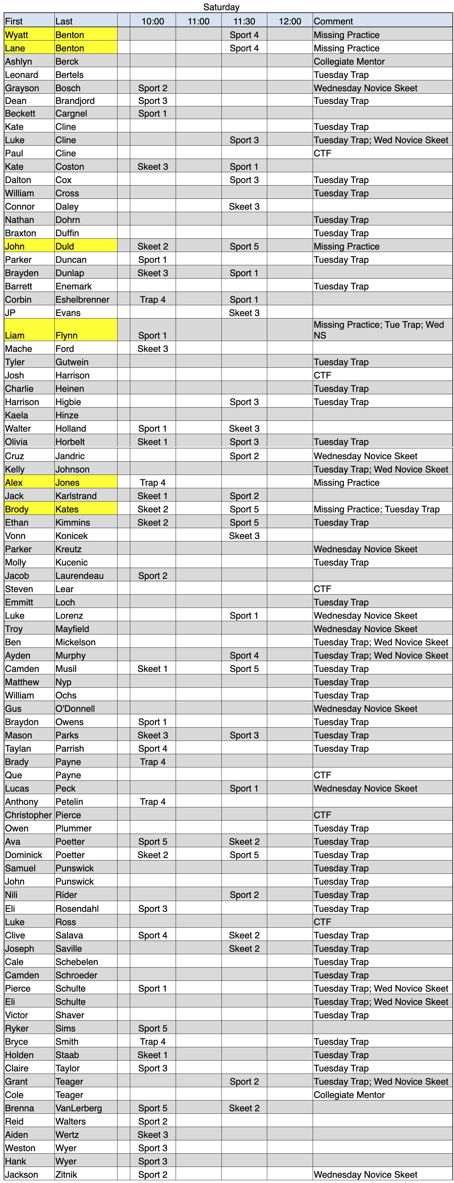Please review the schedule below. If you are missing or listed under the wrong discipline, please let me know. While the coaches have worked hard to schedule everyone, errors can occur.