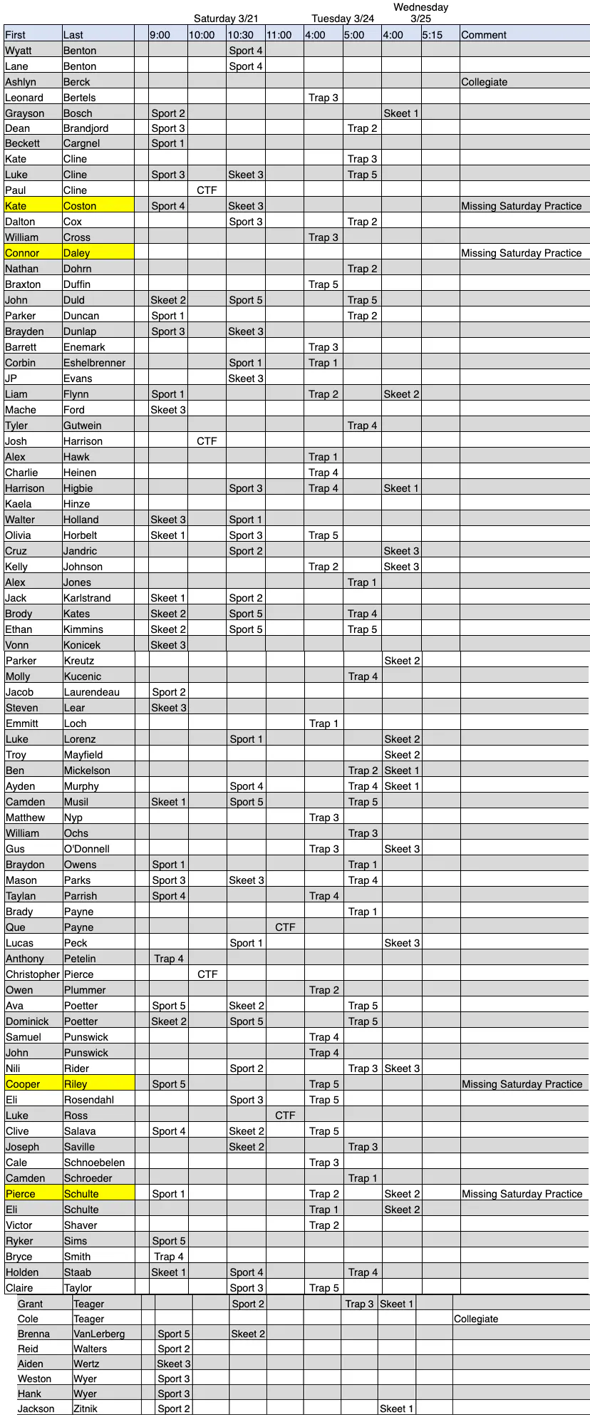 - Skeet [SCTP, SKEET]: March 21 at Powder Creek (following practice). This is recommended for athletes with prior Skeet experience. We have limited spots for this shoot and therefore will need to prioritize experienced athletes into the available spots. Register