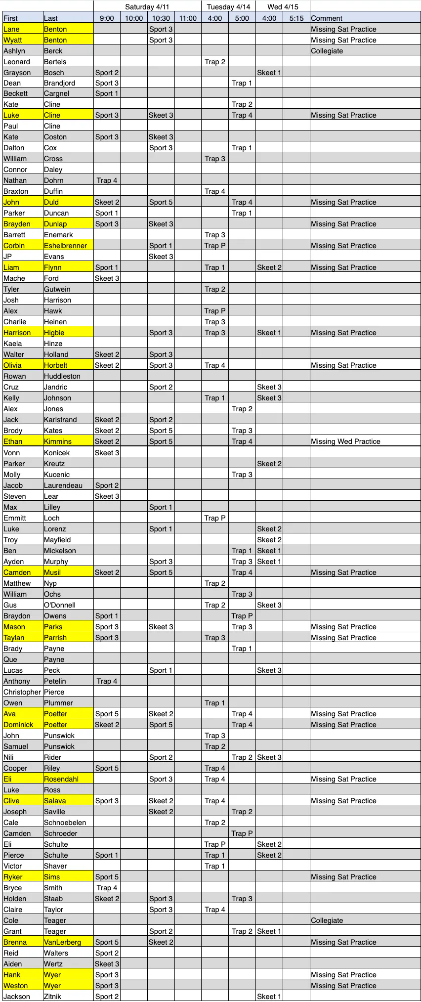 For example, if you typically shoot Sporting at 9:00 on Saturday and Skeet at 10:30, this weekend you would practice Sporting at Cedar Hill during the 8:30 to 9:45 Flight. When Sporting practice ends, drive to Powder Creek for your 10:45 to Noon Skeet practice.
