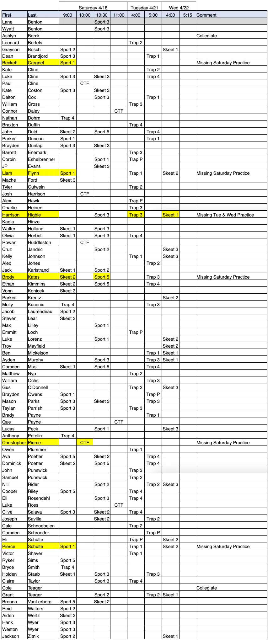 - Please review the sign-in sheet carefully as you may be practicing at both clubs. Flight times follow: